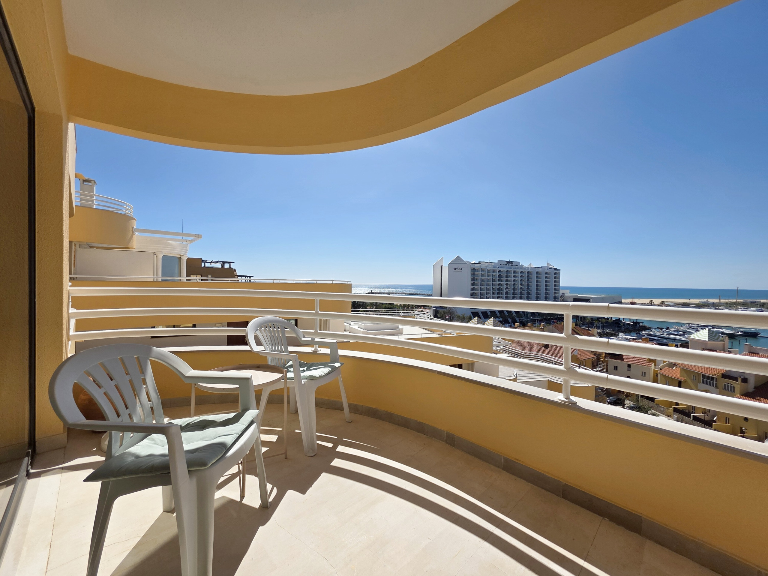 • Acceso directo a balcón, una mesa de comedor exterior con 4 sillas y dos tumbonas, con vista espléndida sobre piscina, marina y mar