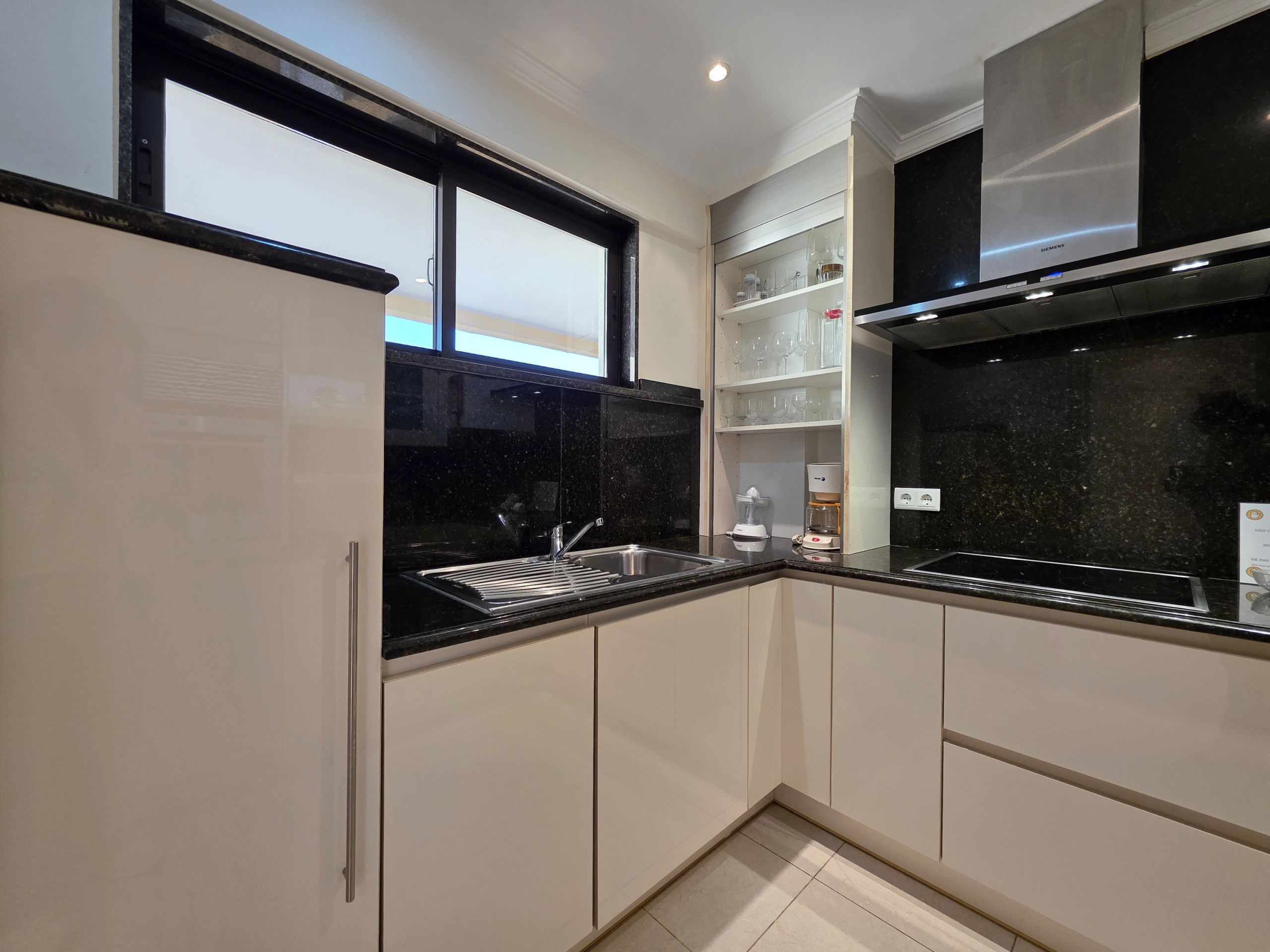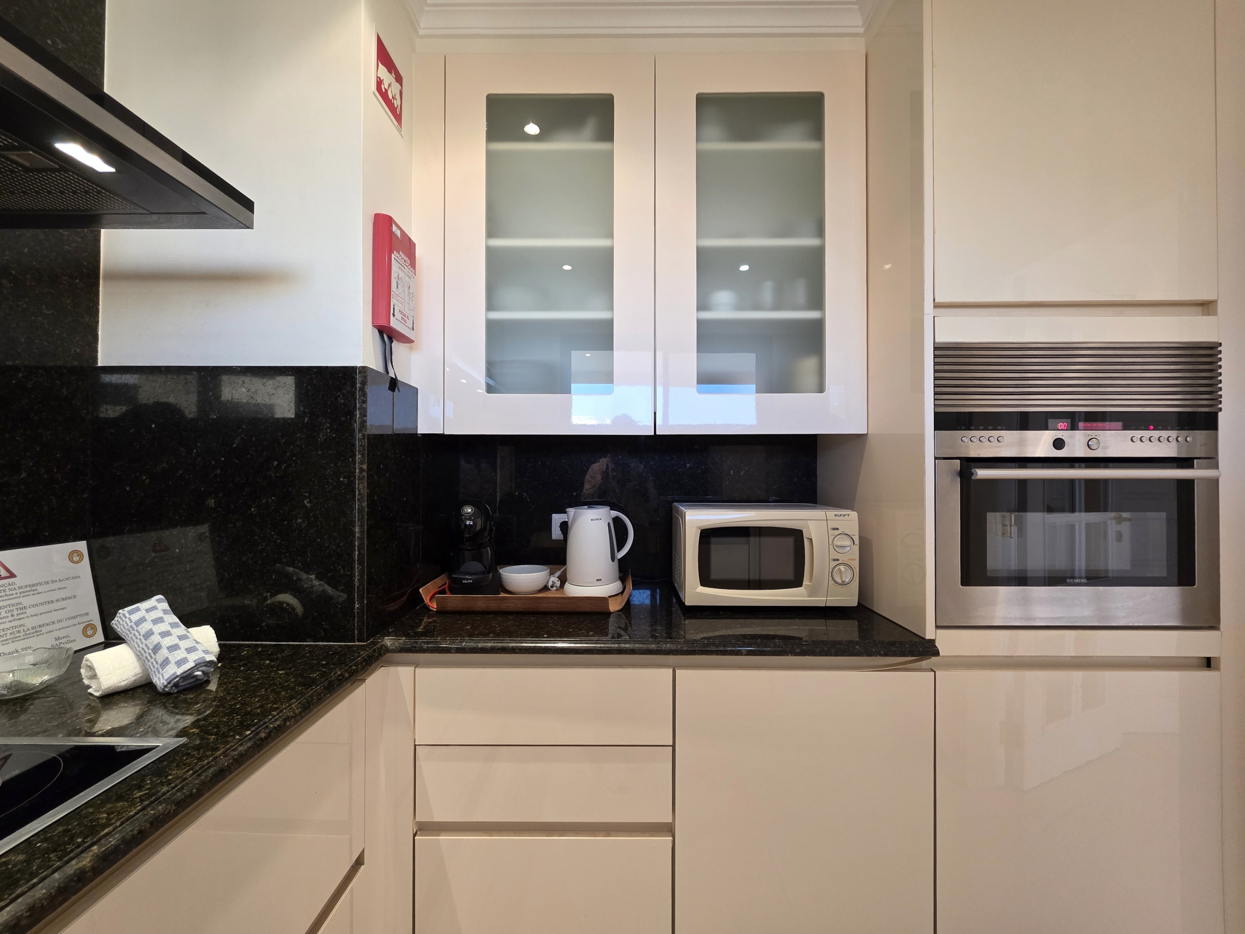 • Cocina completa, equipada con frigorífico con congelador, placa de cocina eléctrica, horno, microondas, lavavajillas, cafetera (Nespresso), hervidor, tostadora, vajilla, cubiertos y utensilios de cocina.