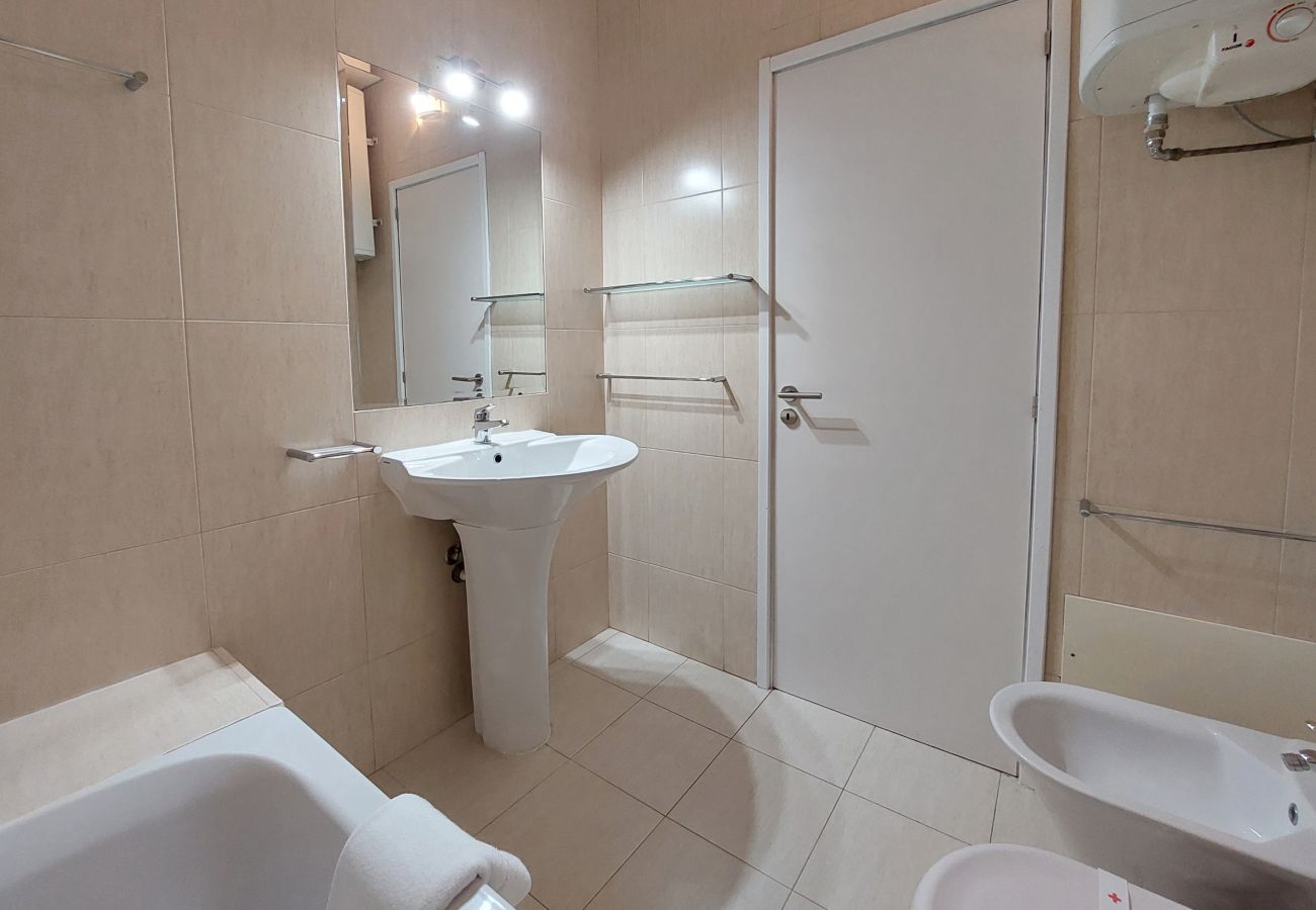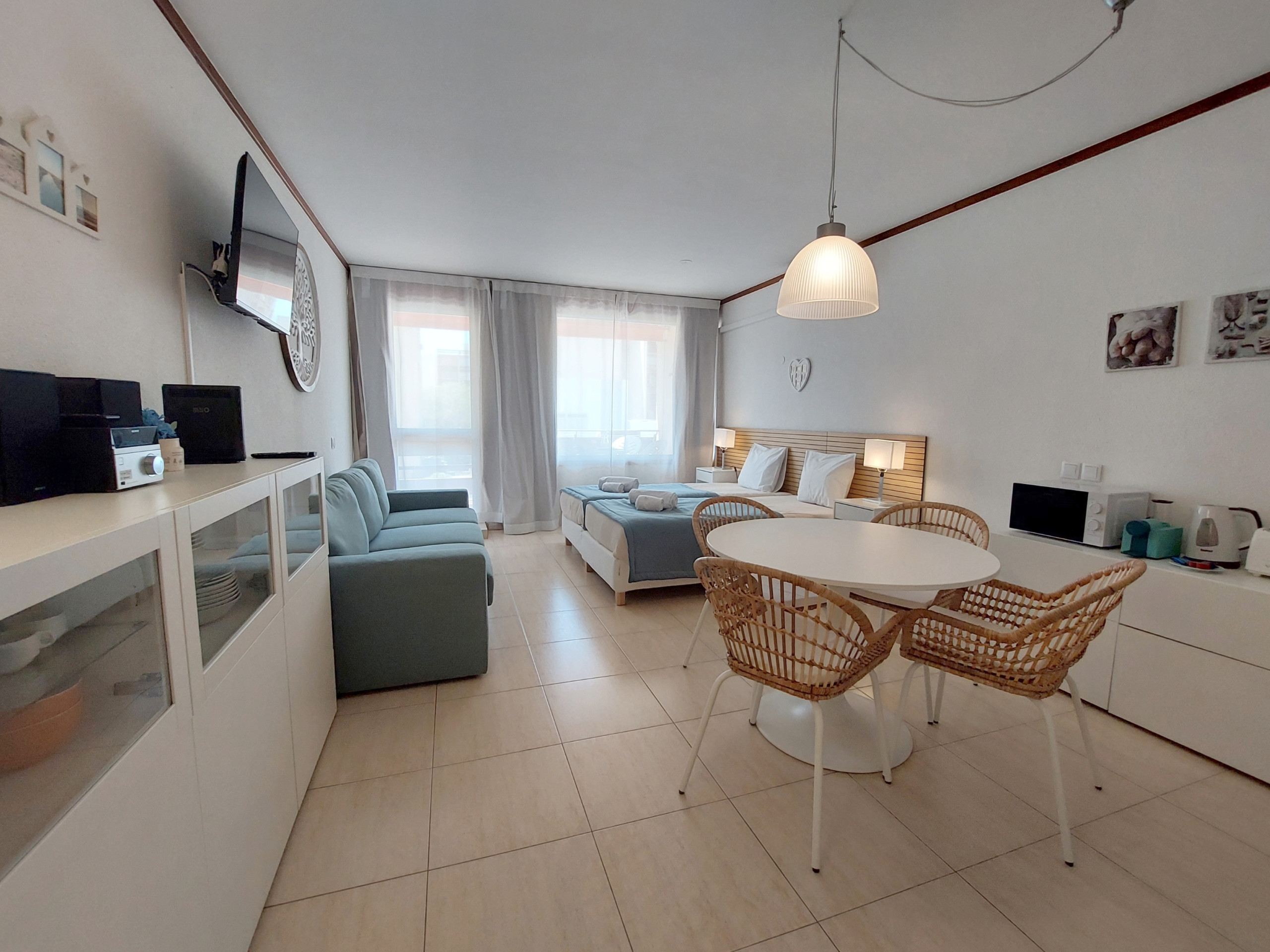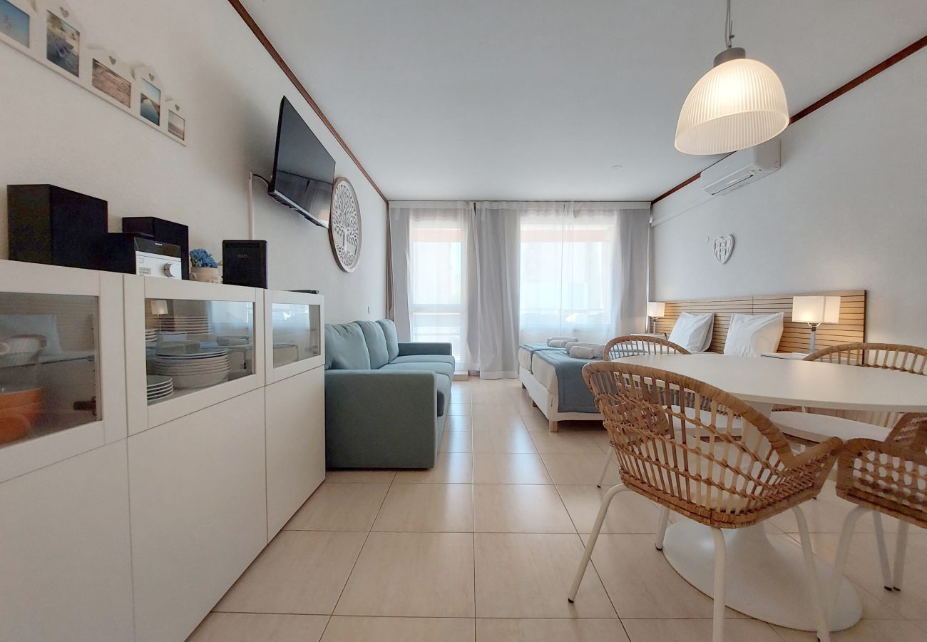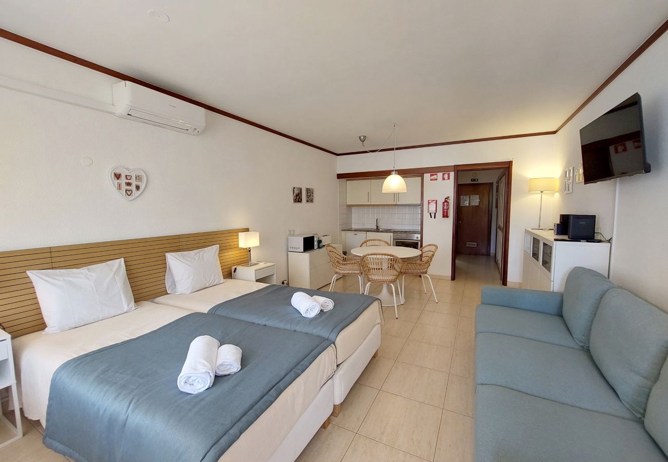 El estudio se encuentra en el Edificio Loulé, en el 2º piso con acceso por ascensor. Es un estudio en un edificio residencial, cómodo y práctico, con capacidad para hasta 4 huéspedes. Dispone de una zona de cocina, sala de estar y dormitorio, con cocina completa, mesa de comedor, 1 sofá cama doble, 2 camas individuales, un baño completo, balcón, TV, WiFi gratuito y air acondicionado.