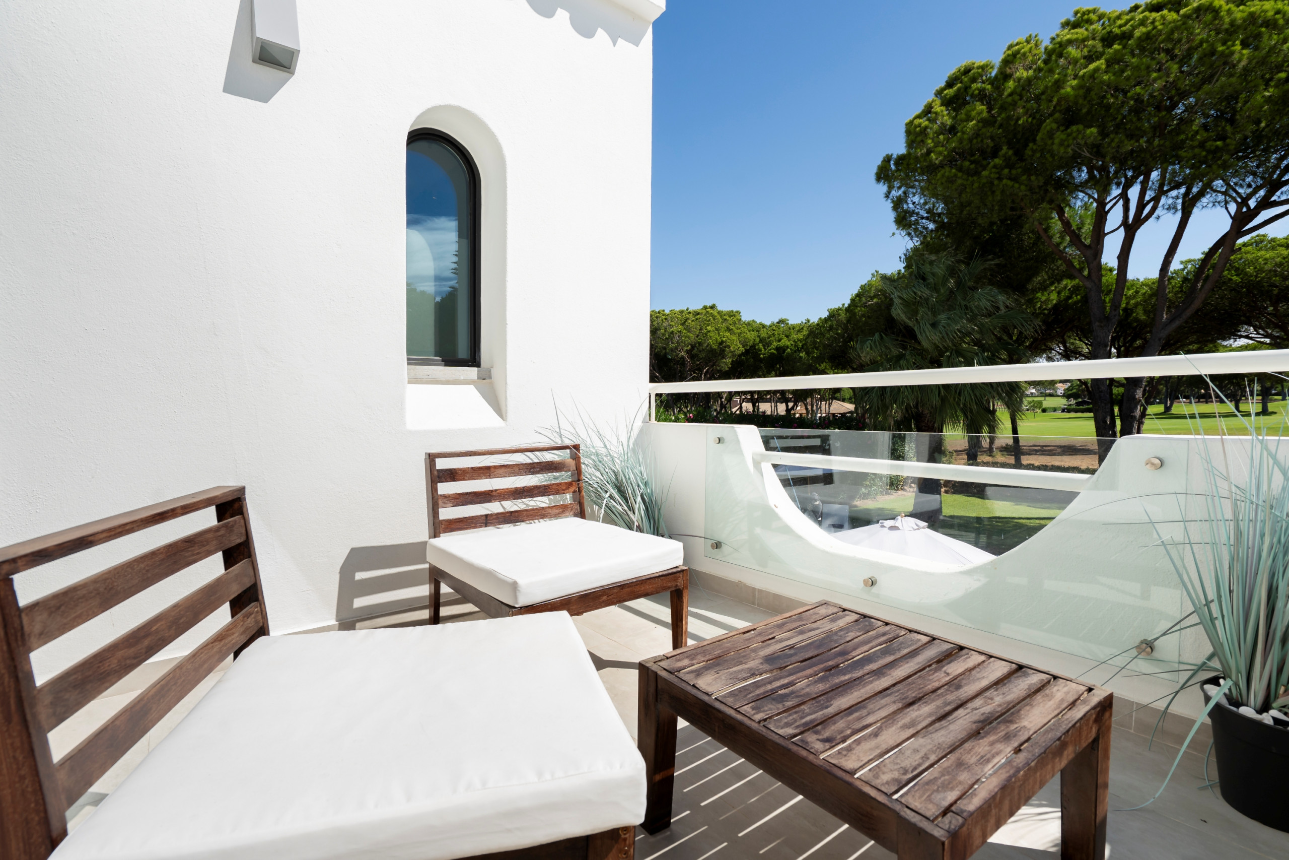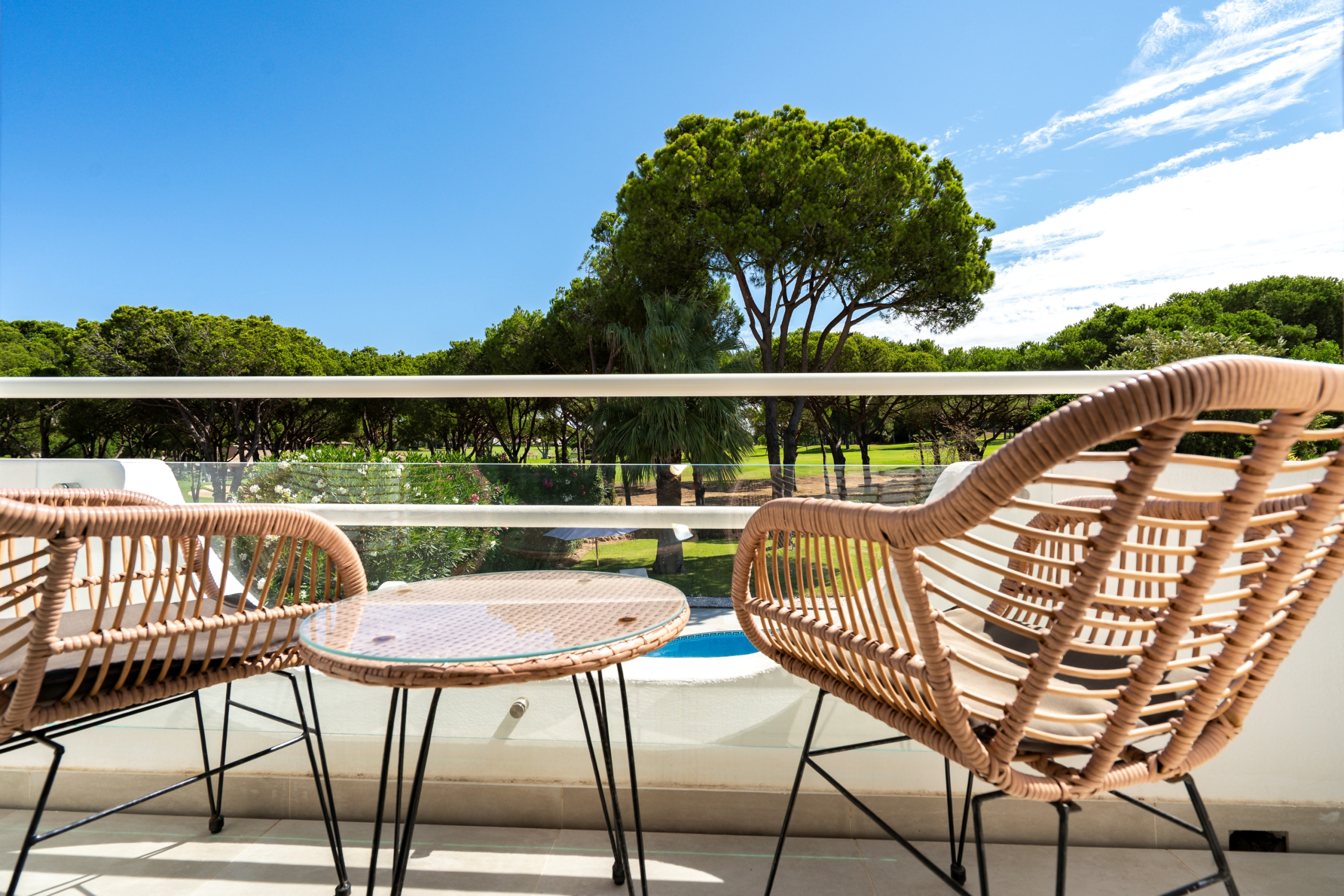 Balcón privado con dos sillas y mesa de café con vistas a la piscina/jardín y vistas espectaculares al Campo de Golf Pinhal.