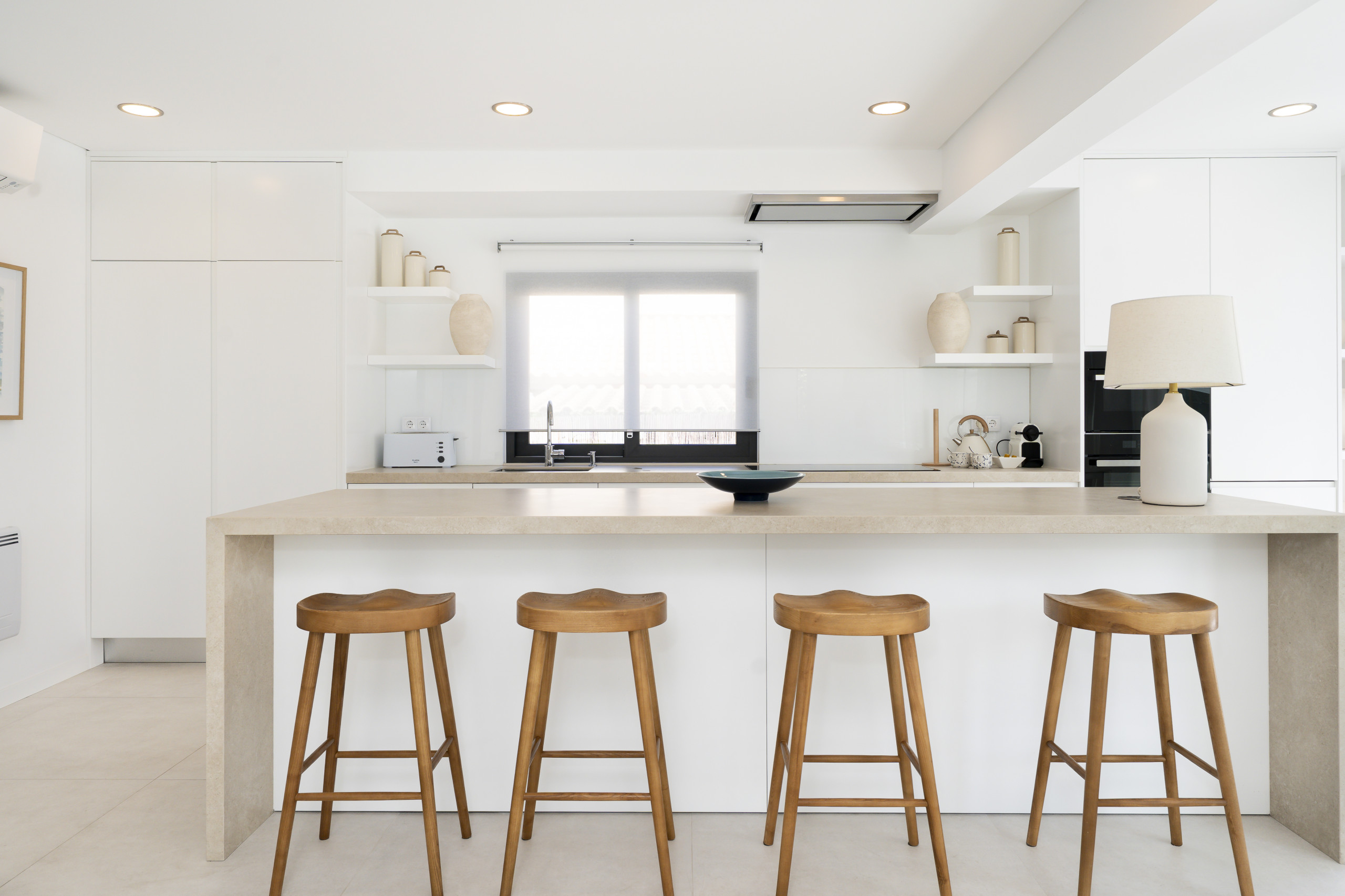 Cocina de concepto abierto, de tamaño generoso, equipada con frigorífico, congelador, vitrocerámica, horno, microondas, lavavajillas, cafetera Nespresso, hervidor de agua, tostadora, vajilla, cubertería y utensilios de cocina.Encimera para comidas con capacidad para cuatro personas.