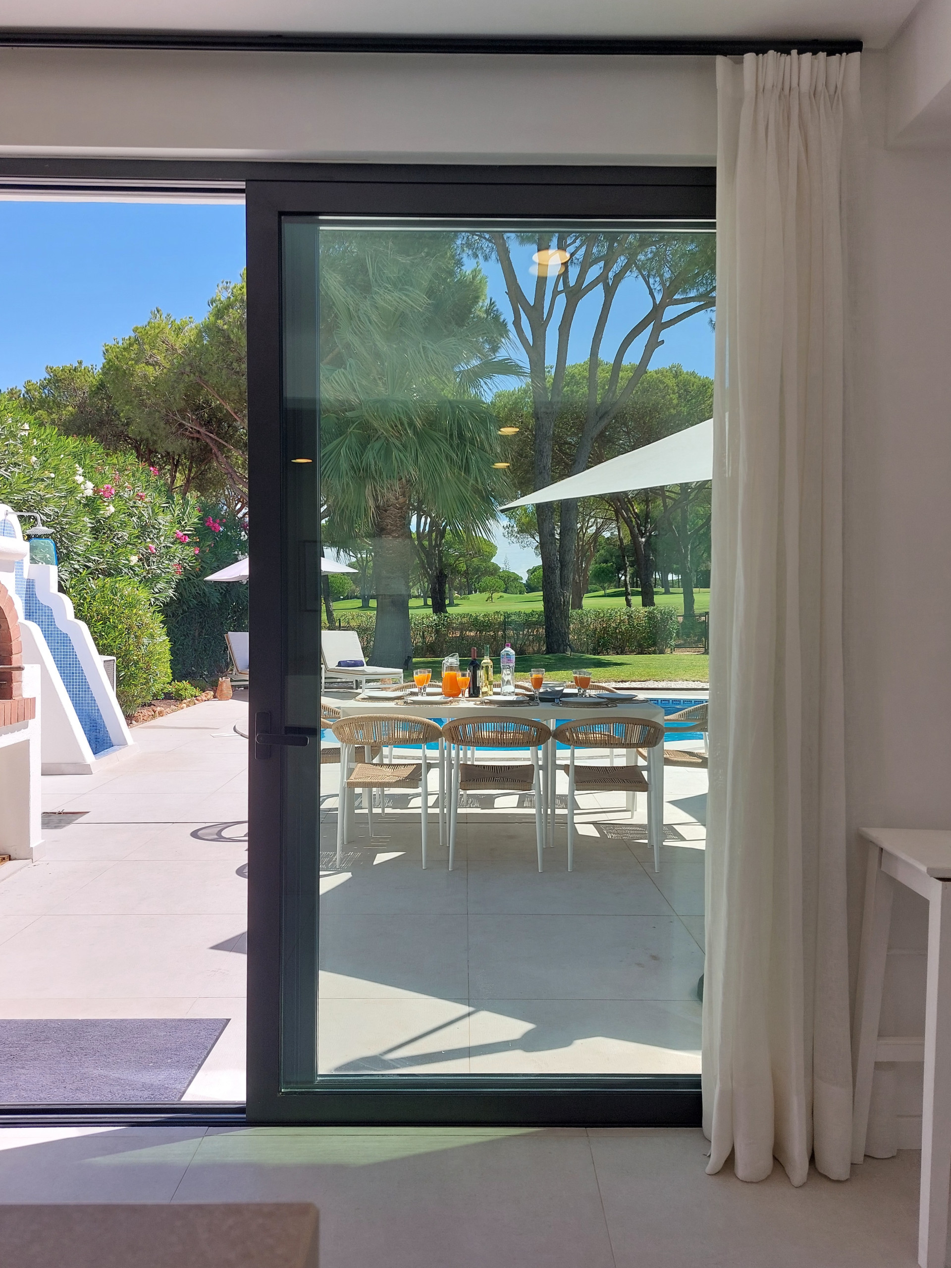 Amplia sala de estar con techos altos, con mesa de comedor y sillas para 8 personas, un gran y cómodo sofá y sillones dispuestos. La luz natural entra a través de 4 grandes ventanales que se abren a una extensa terraza con piscina exterior y un jardín maduro que linda con el Pinhal Golf Course.