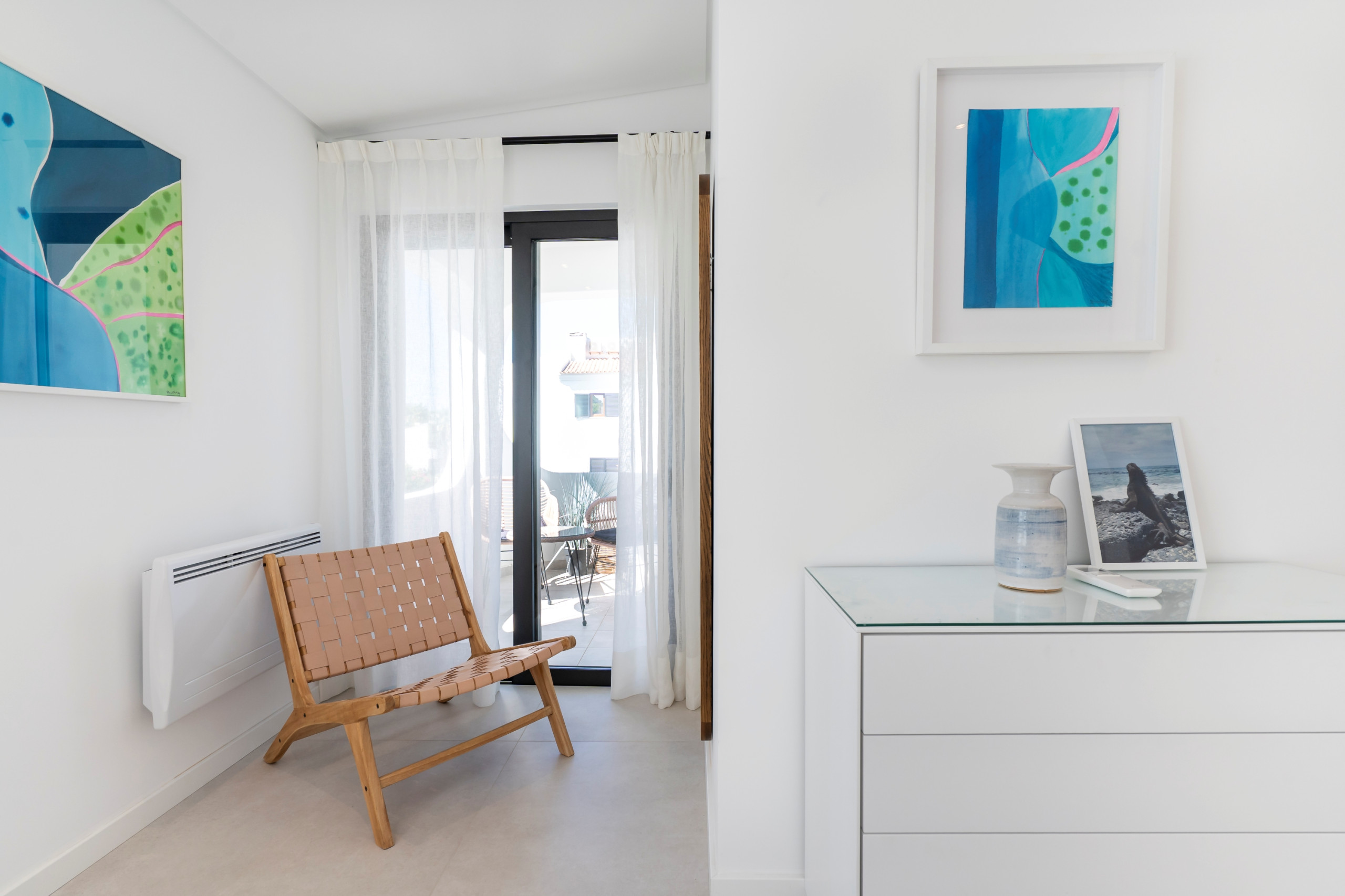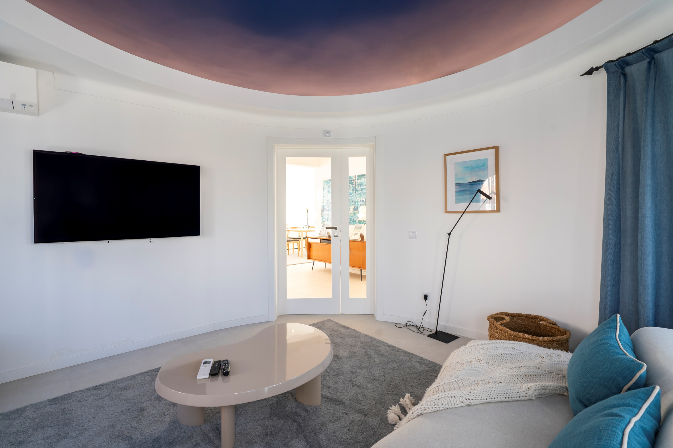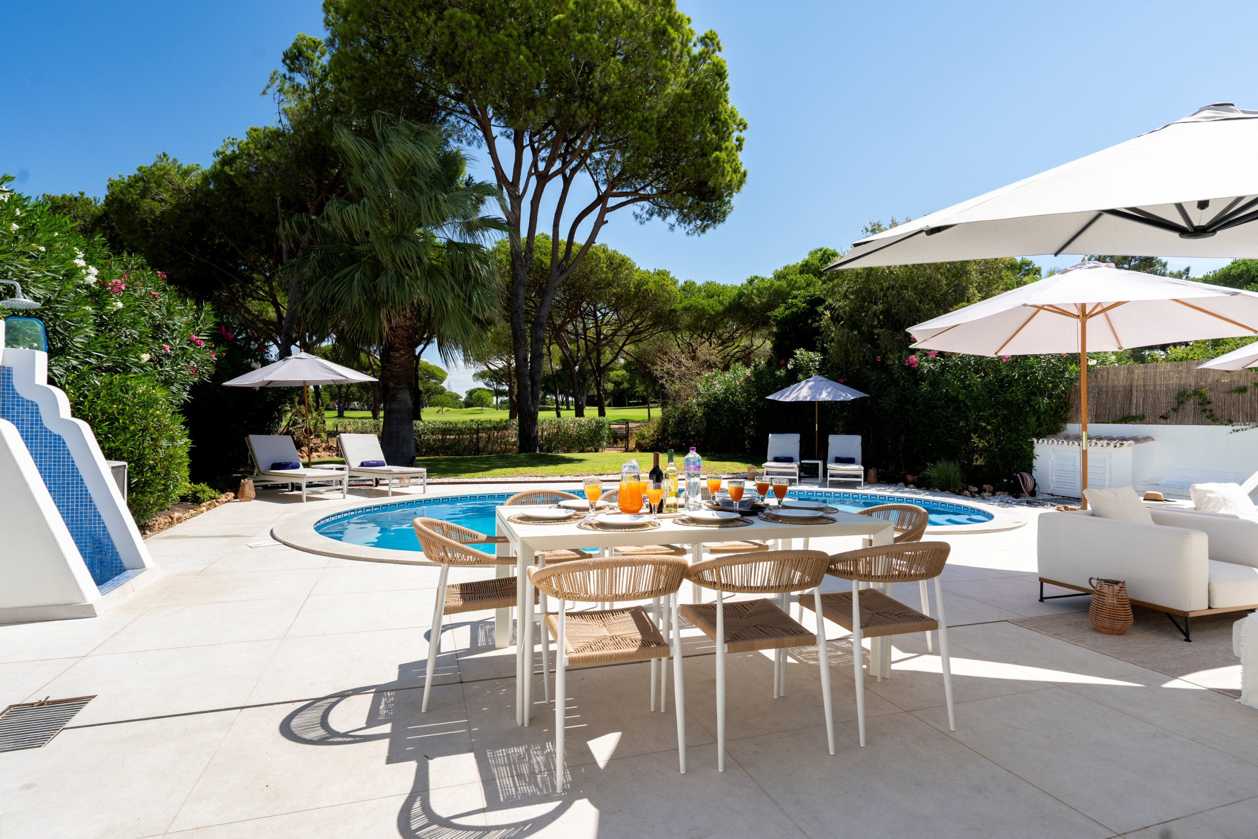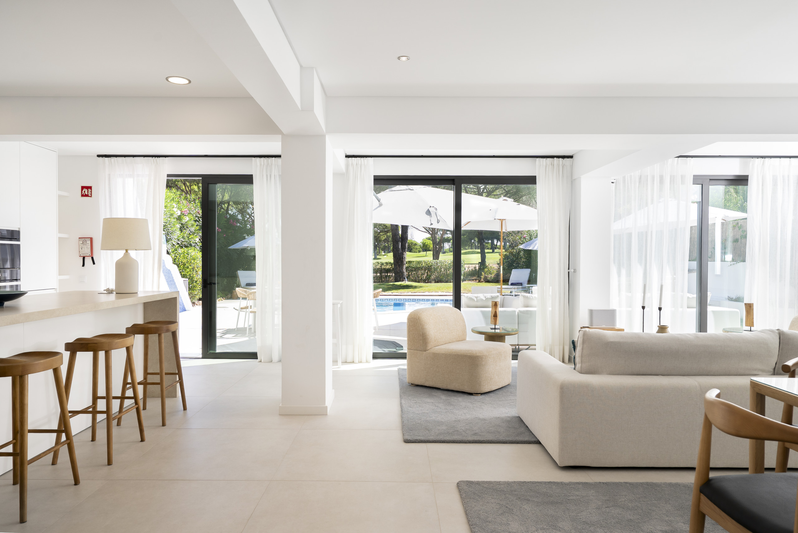 Un salon spacieux avec de hauts plafonds, doté d'une table à manger et de chaises pour 8 personnes, d'un grand canapé confortable et de fauteuils. La lumière naturelle pénètre par 4 grandes baies vitrées qui s'ouvrent sur une vaste terrasse avec une piscine extérieure et un jardin luxuriant qui borde le Pinhal Golf Course.