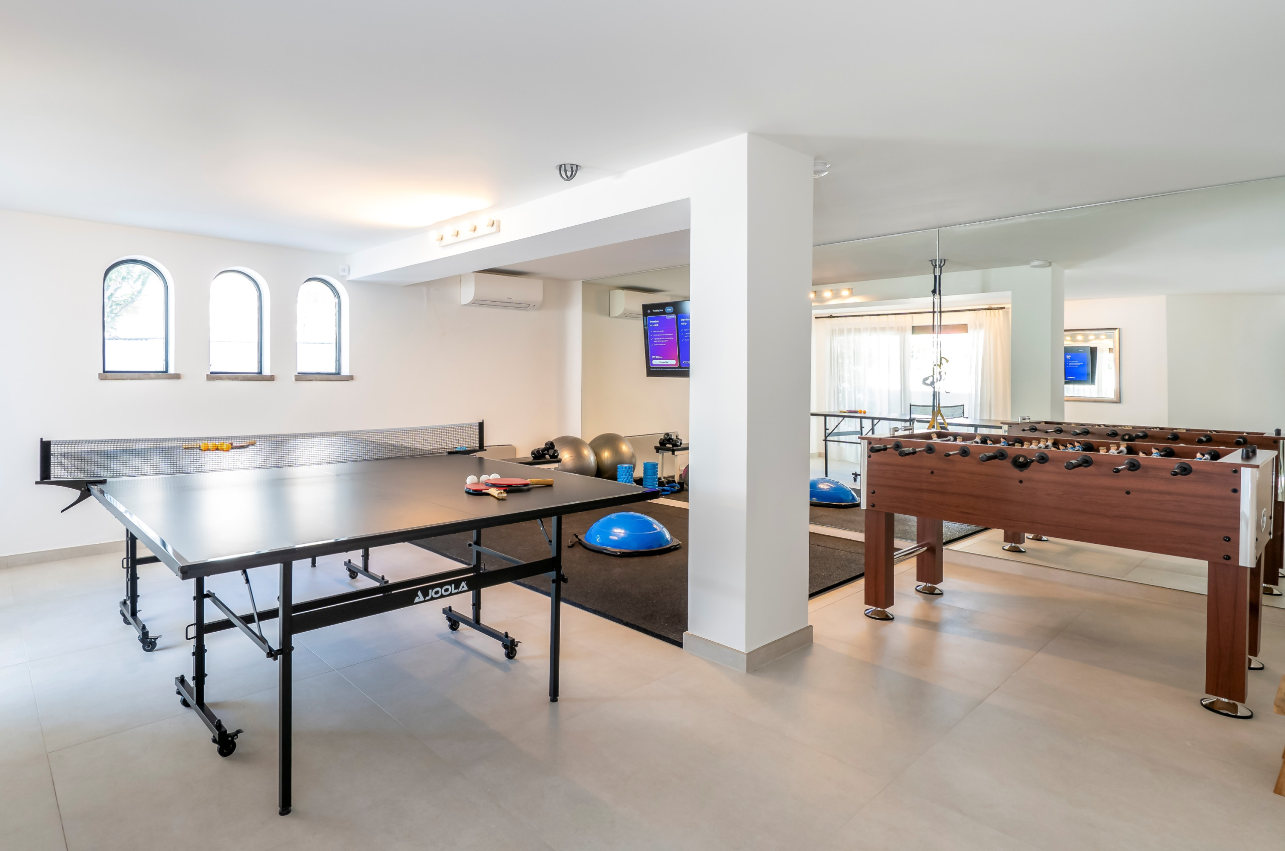 Une salle de jeux spacieuse avec une table de ping-pong, un baby-foot et une zone d'exercice pour l'entraînement ou le yoga.