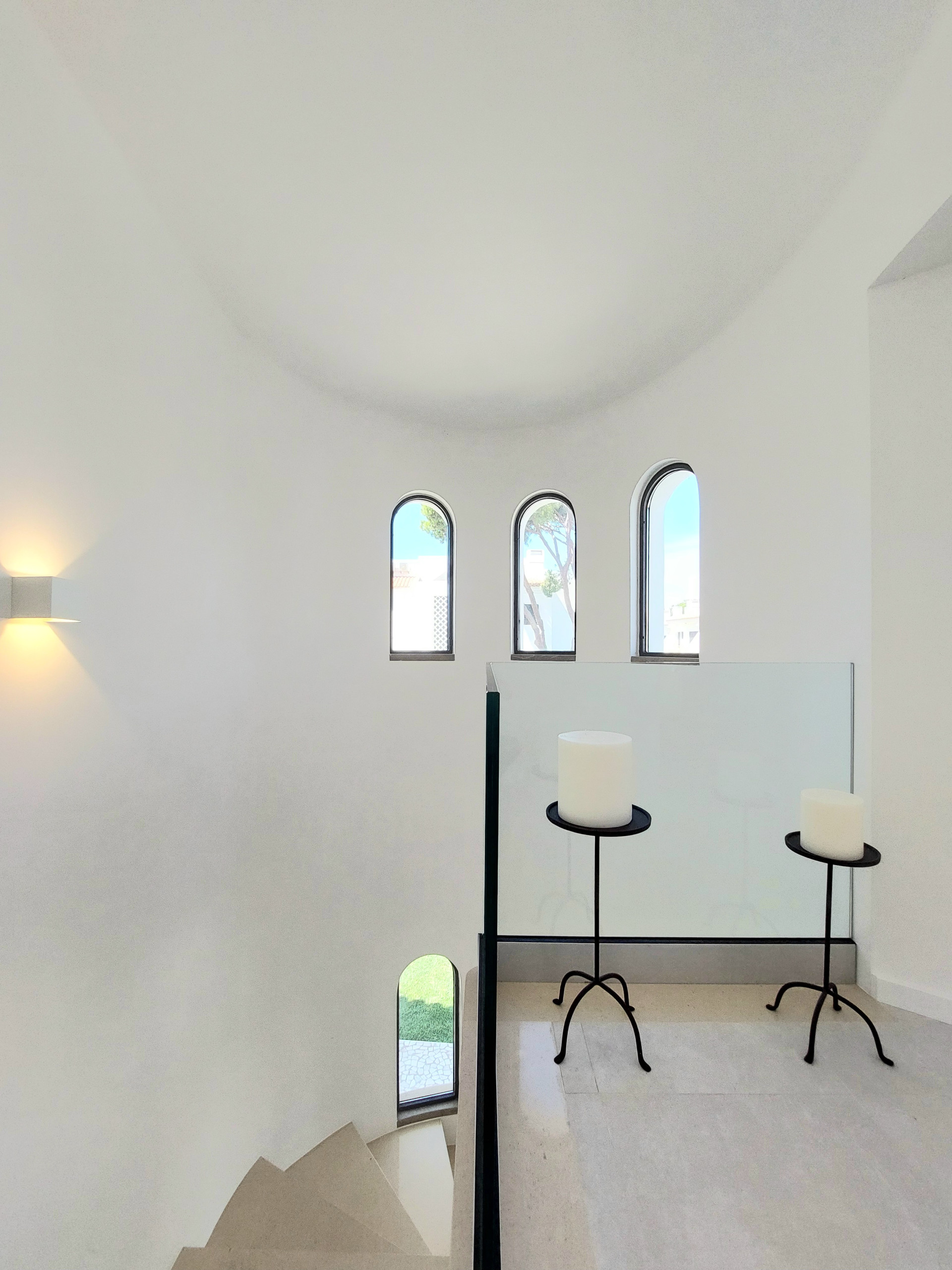 Une salle de télévision circulaire spectaculaire avec un plafond voûté, des portes doubles et une lumière naturelle abondante.